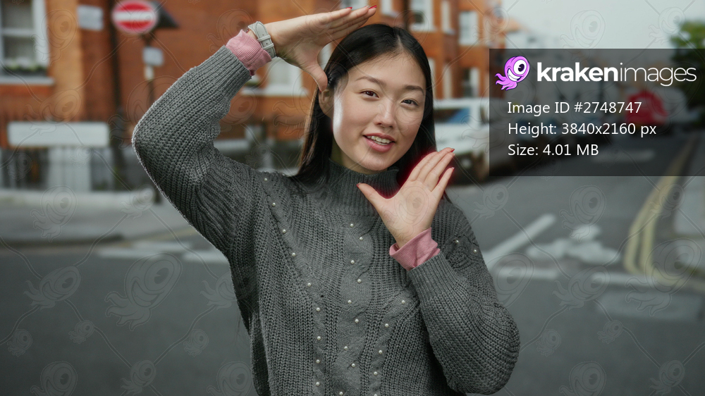 Woman smiling outdoors city street wearing gray sweater posing lively, young chinese woman framed against urban backdrop showcasing vibrant energy.