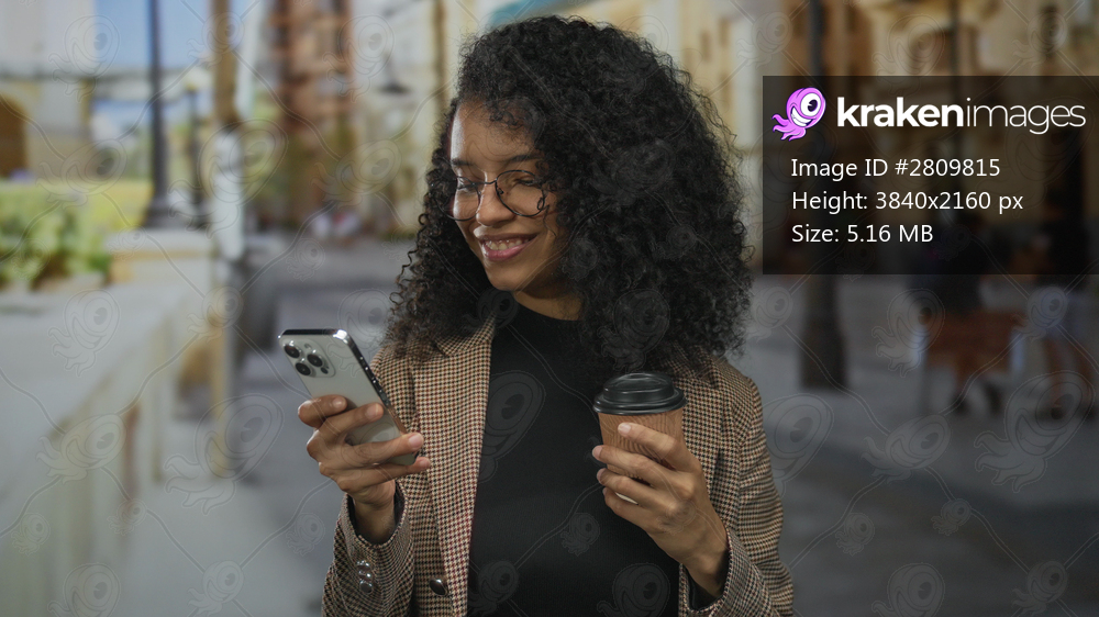 Woman smiling outdoors with coffee cup and smartphone in vibrant urban street.