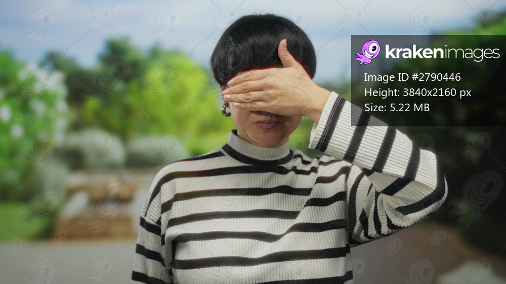 Woman smiling outdoors covering eyes wearing striped sweater in a vibrant green background enjoying a sunny day in an urban park setting in the city.