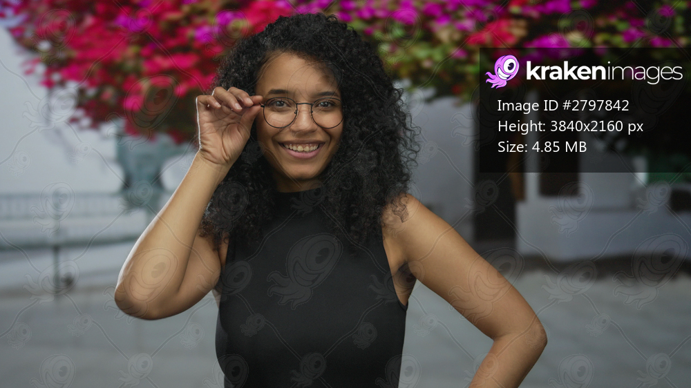 Woman smiling outdoors with curly hair and glasses, surrounded by vibrant flowers, showcasing natural beauty and confidence in a bright, colorful setting. - Kraken Images