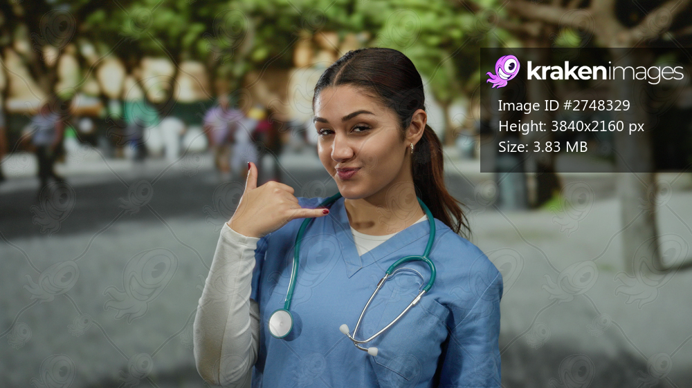 Woman smiling outdoors gestures phone call wearing blue scrubs and stethoscope while standing on a busy street surrounded by trees and pedestrians.