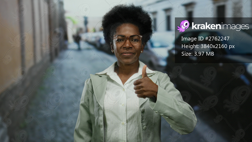 Woman smiling outdoors giving thumbs up in a city street with cars and buildings visible in the background showing a positive gesture