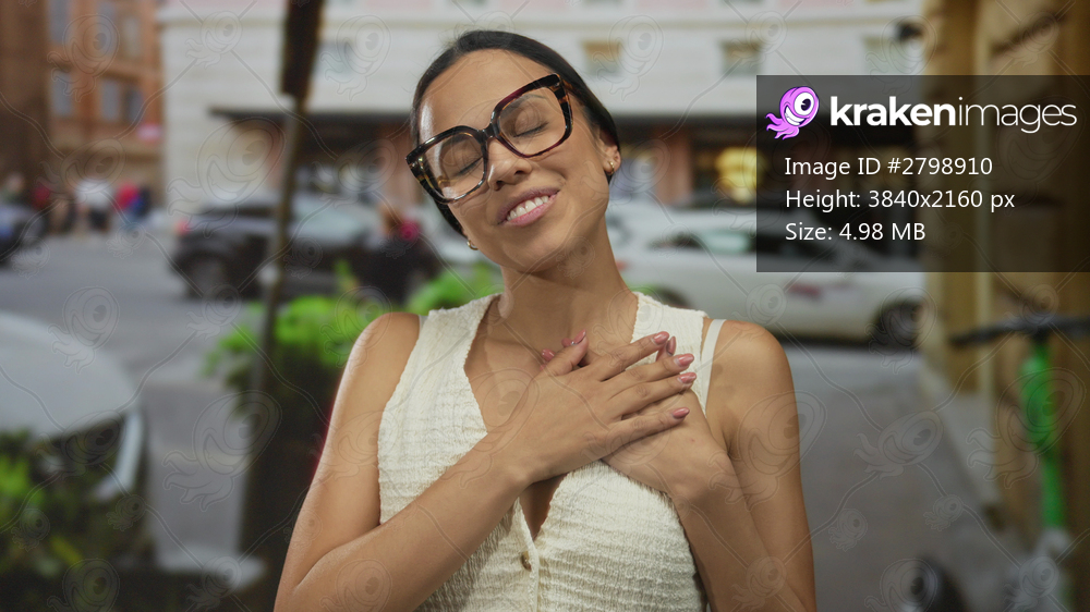 Woman smiling outdoors with glasses and white top, expressing gratitude on a busy street, conveying happiness and positivity in an urban setting.
