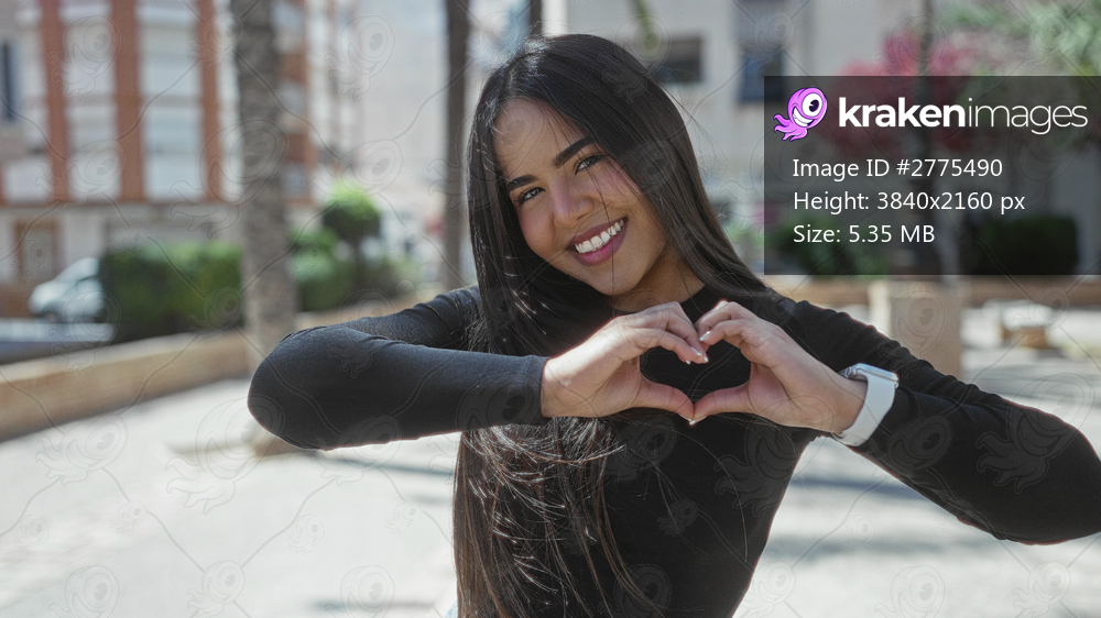 Woman smiling outdoors with heart gesture in urban street setting evokes happiness and youth with a vibrant and fresh atmosphere enhanced by natural sunlight. - Kraken Images