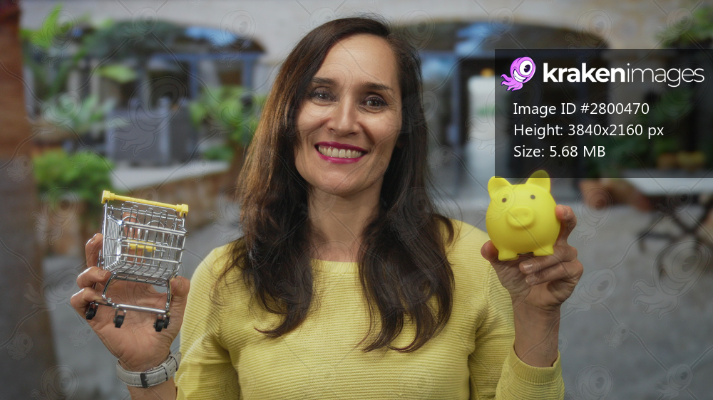 Woman smiling outdoors holding a yellow piggy bank and small shopping cart, embodying concepts of saving and financial planning in a sunny courtyard.