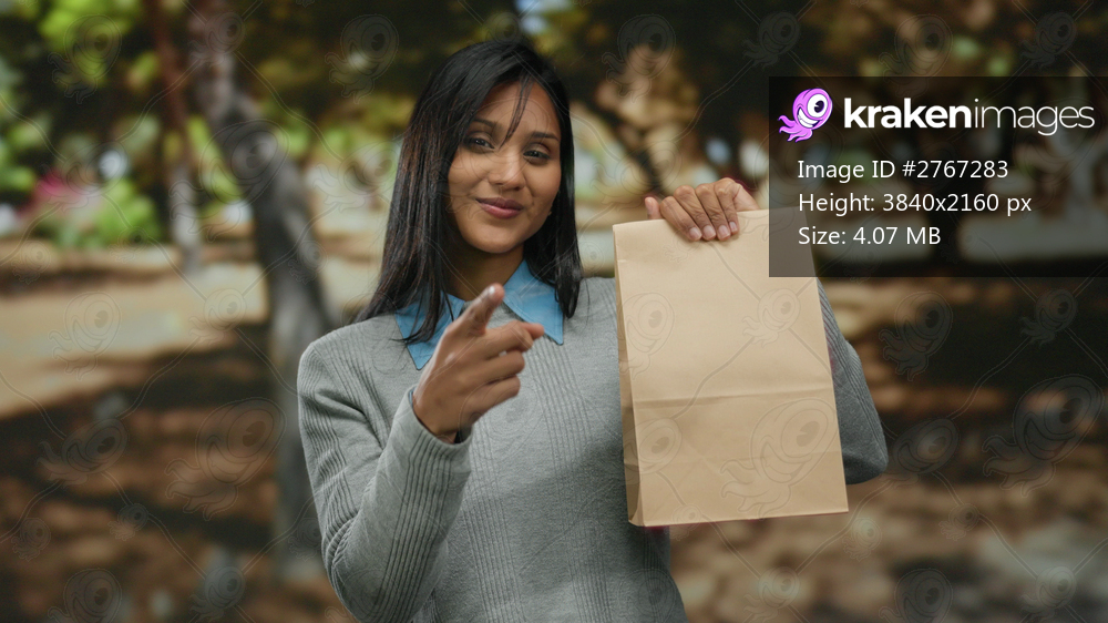 Woman smiling outdoors holding blank paper bag in sunny park with trees in background suggesting casual interaction.