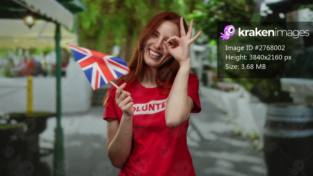 Woman smiling outdoors holding british flag in city street with red hair wearing volunteer shirt showing okay gesture with hand.
