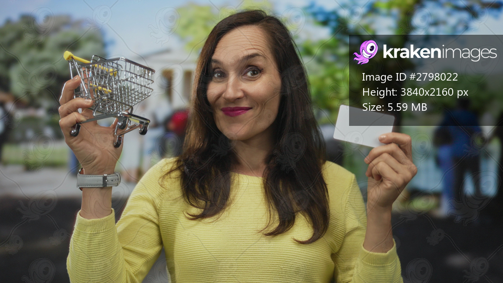 Woman smiling outdoors holding credit card and miniature cart in a sunny park setting, embodying shopping and finance themes with a joyful expression.