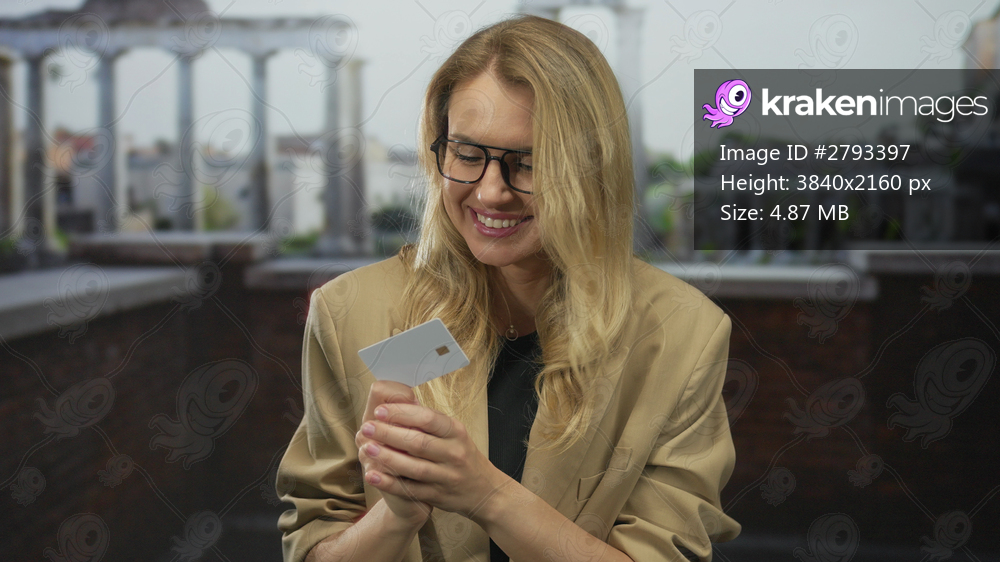 Woman smiling outdoors holding credit card with ruins in background, wearing glasses and blazer, showcasing travel excitement in ancient european setting. - Kraken Images