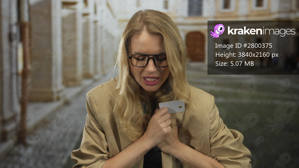 Woman smiling outdoors holding credit card tightly against the chest in an old city street with a contented expression and wearing a beige jacket and glasses. - Kraken Images