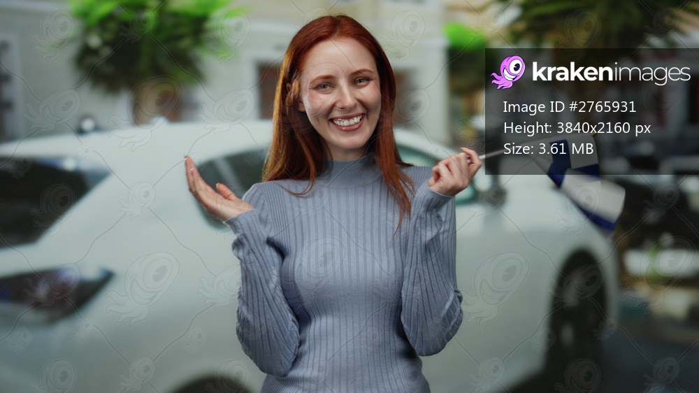 Woman smiling outdoors holding finnish flag in city street with red hair and wearing blue sweater, radiating joy and national pride against urban backdrop. - Kraken Images