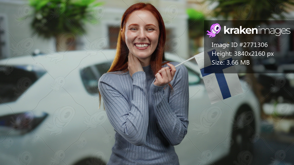 Woman smiling outdoors holding finnish flag in city street with red hair and wearing blue sweater, radiating joy and national pride against urban backdrop. - Kraken Images