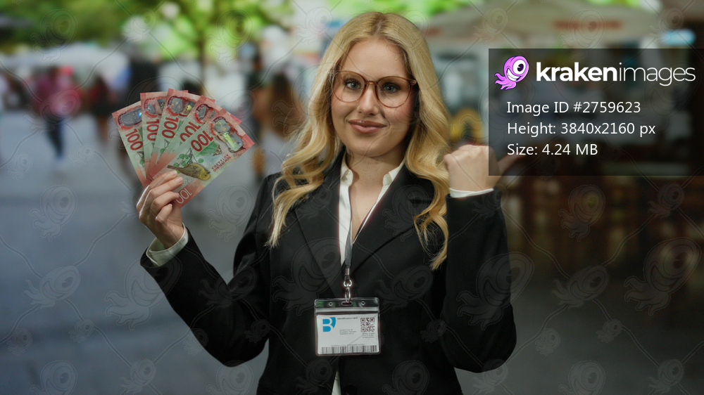 Woman smiling outdoors holding new zealand dollars, wearing business attire and id badge, standing on a busy city street.