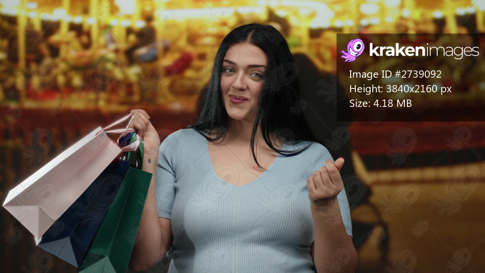 Woman smiling outdoors holding shopping bags with a background of bright lights in a lively fair setting, capturing an air of joy and leisure.