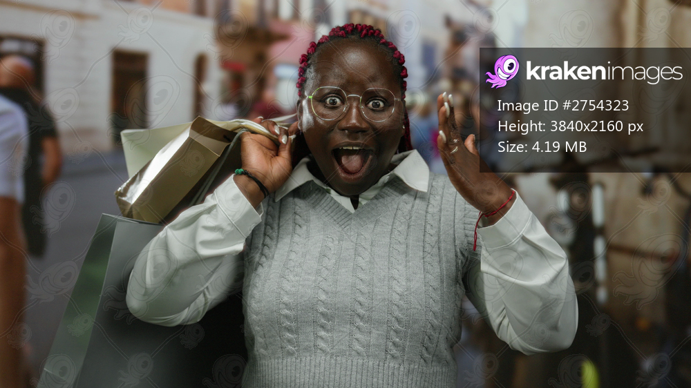 Woman smiling outdoors holding shopping bags on city street with excitement and joy, showcasing urban lifestyle and consumerism.
