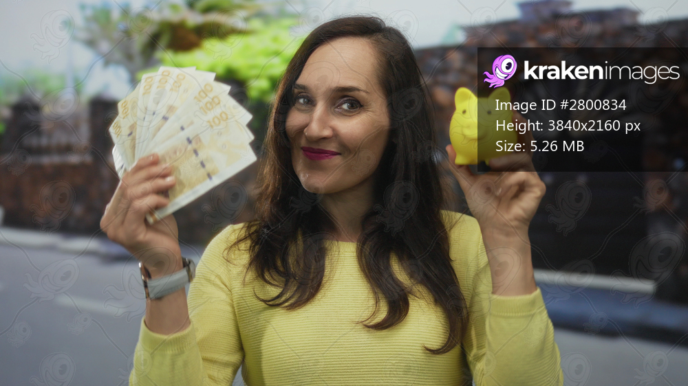 Woman smiling outdoors holding swedish krona banknotes and a yellow piggy bank on a street, symbolizing savings and financial security.