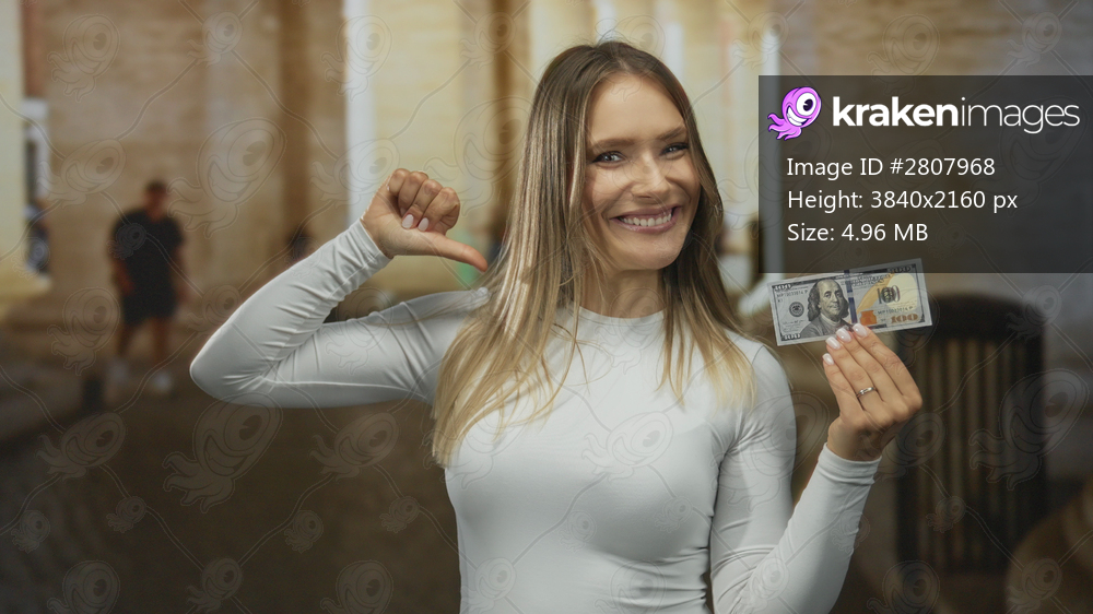 Woman smiling outdoors holding us dollar banknote at an old university setting confidently pointing at herself with her thumb.