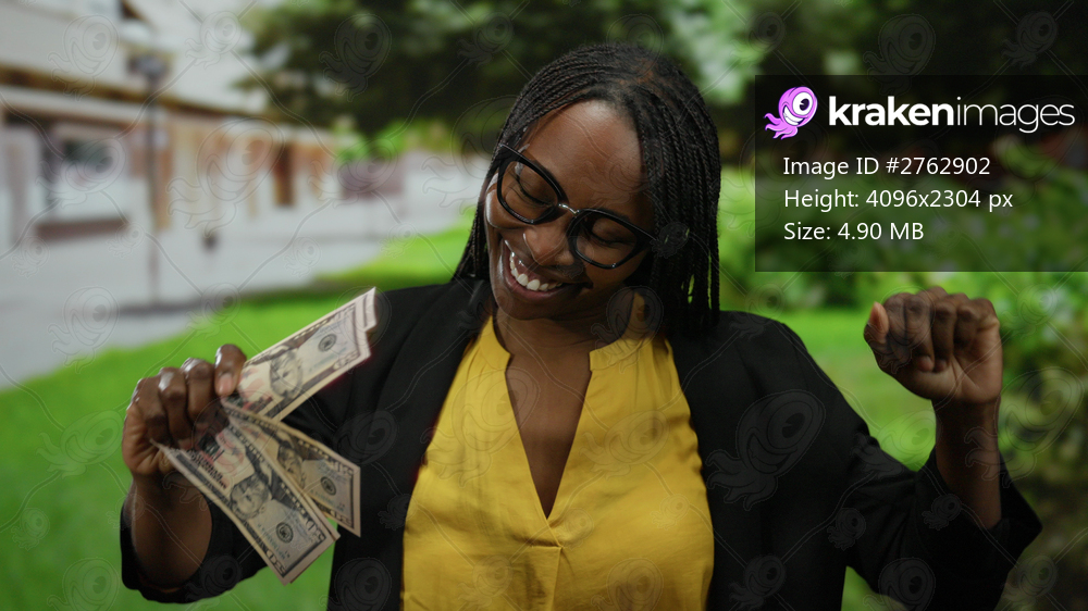 Woman smiling outdoors holding us money in a park, expressing happiness and financial success amid greenery and bright environment.