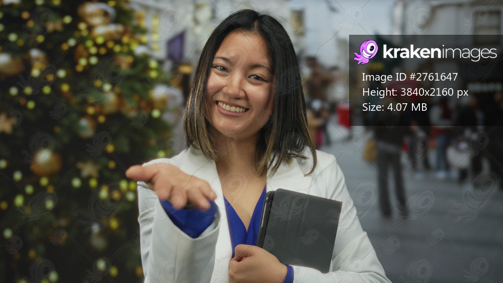 Woman smiling outdoors in a city street holding a tablet with festive decorations and reaching out with a friendly gesture.