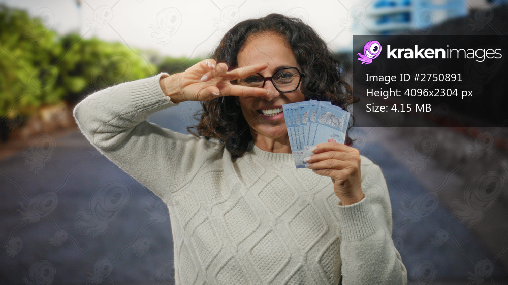 Woman smiling outdoors in a city street in malaysia holding ringgit banknotes doing a peace gesture in front of her eye.