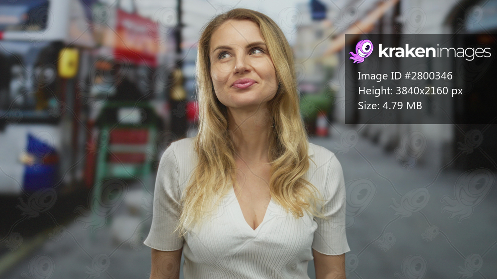 Woman smiling outdoors in a city street with red buses in the background on a bright day, showcasing urban lifestyle and casual fashion.