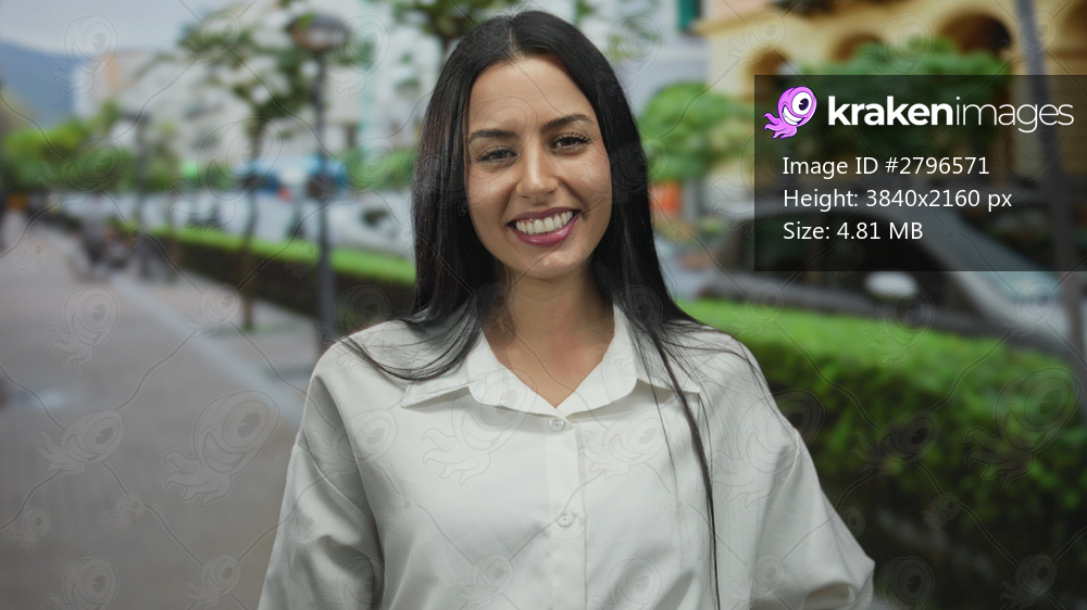 Woman smiling outdoors in a city street; young hispanic woman with long hair and white shirt enjoying urban environment on a sunny day.
