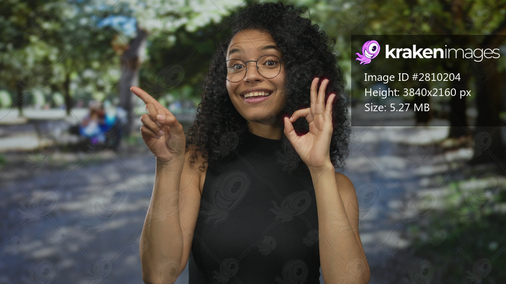 Woman smiling outdoors in a sunny green park setting with trees and wearing glasses and curly hair against a scenic nature backdrop capturing a vibrant youthful atmosphere - Kraken Images