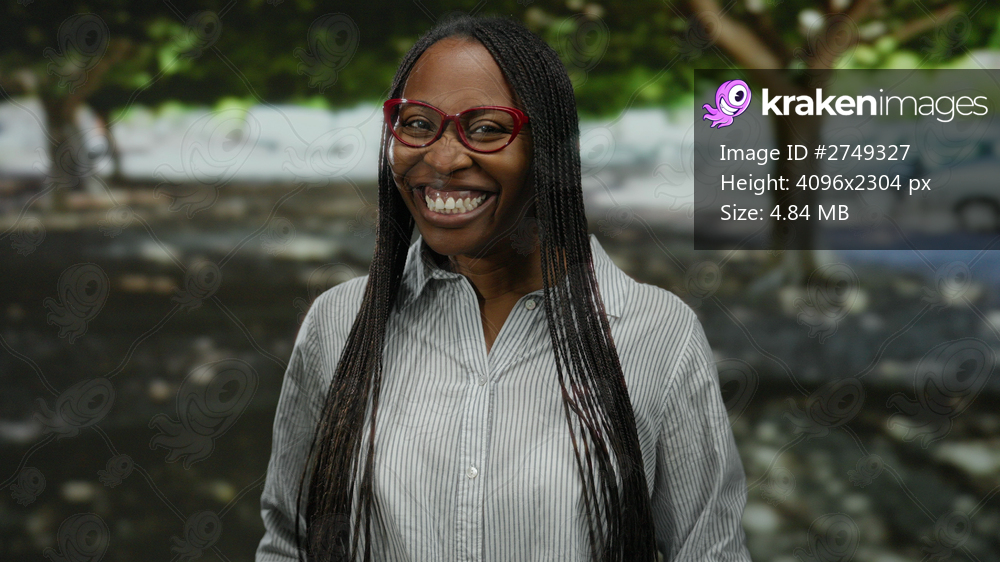 Woman smiling outdoors in a vibrant park with sunlight filtering through trees highlighting her joyful expression, wearing glasses and a striped shirt, exuding happiness and confidence. - Kraken Images