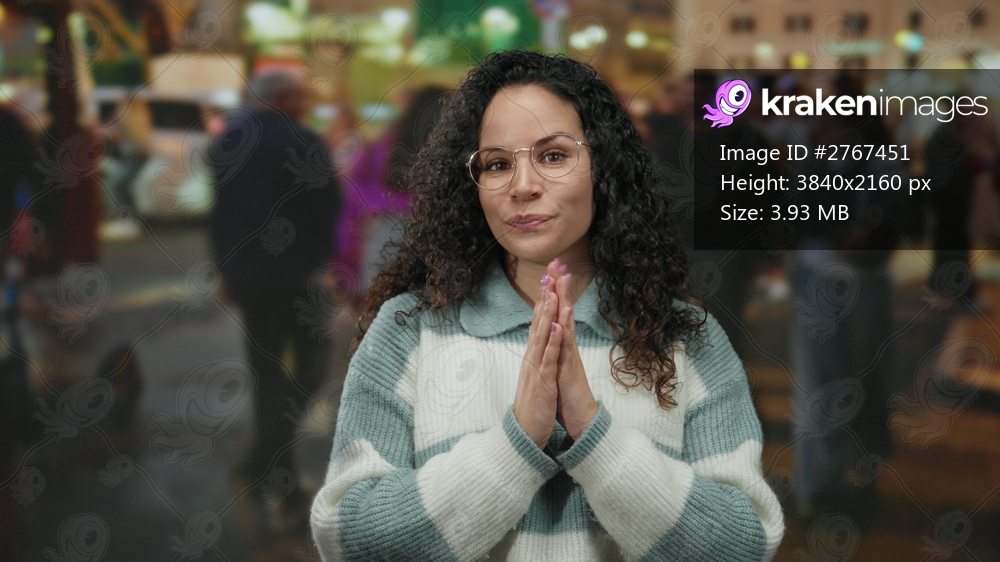Woman smiling outdoors in busy street wearing glasses and sweater surrounded by people walking providing a vibrant urban atmosphere