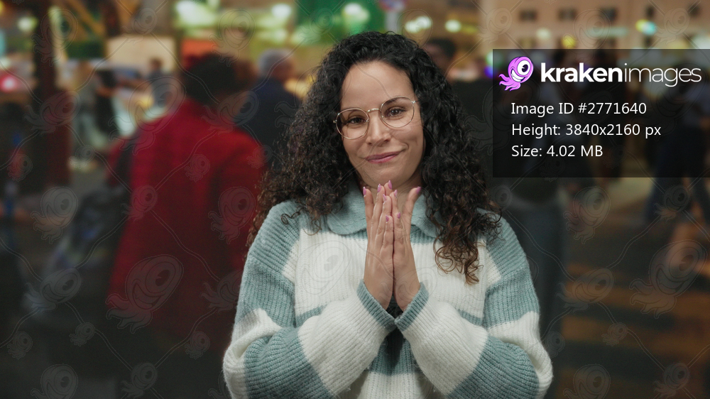 Woman smiling outdoors in busy street wearing glasses and sweater surrounded by people walking providing a vibrant urban atmosphere