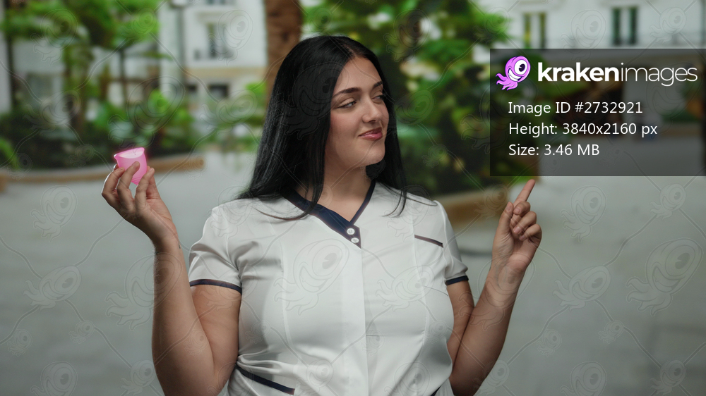 Woman smiling outdoors in city holding pink cup against urban backdrop with tropical plants and buildings.