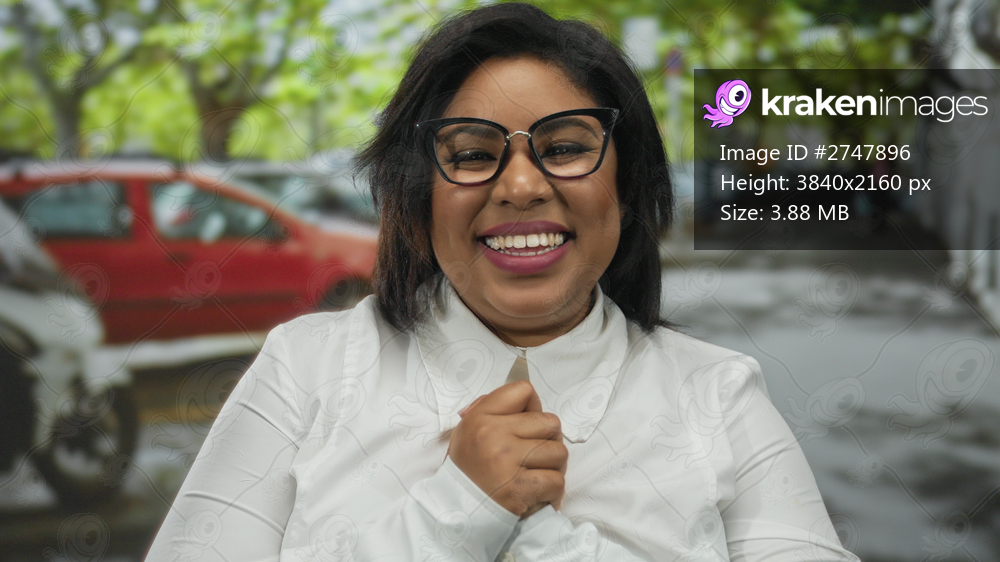 Woman smiling outdoors in city street with cars in background, wearing glasses and white shirt, representing happiness and urban lifestyle.