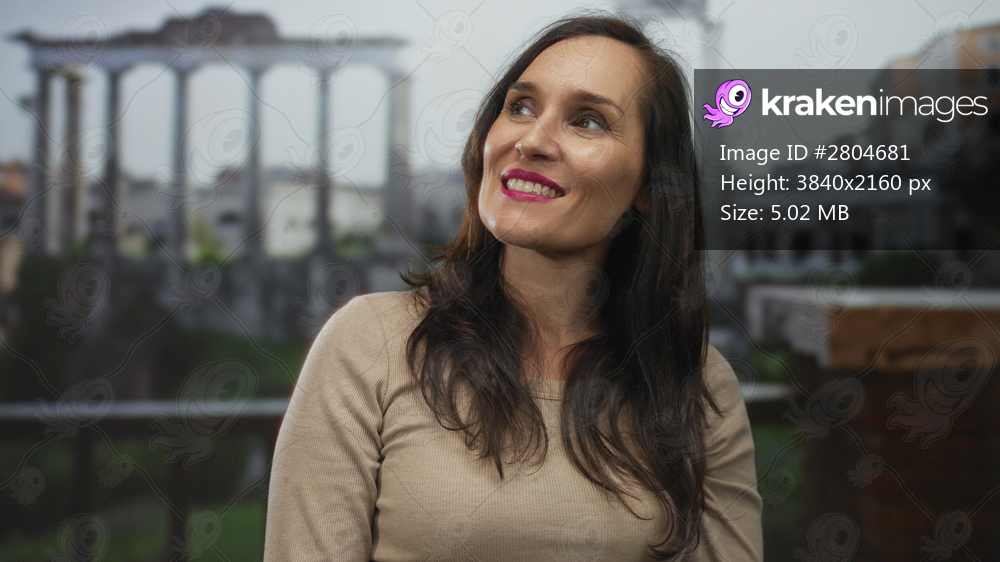 Woman smiling outdoors in roman ruins with columns in the background, wearing casual attire look upward, capturing serene moment in ancient historical site. - Kraken Images