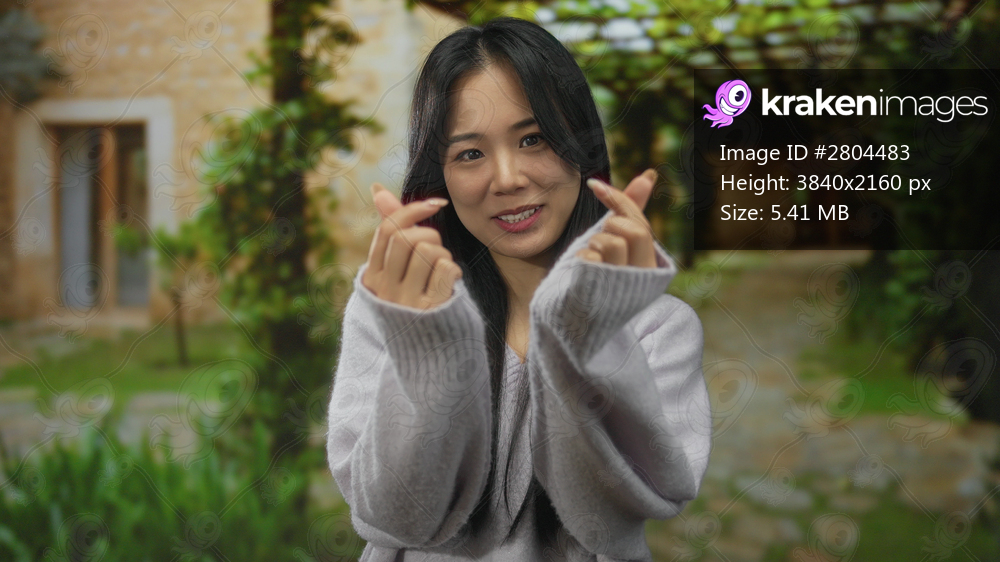 Woman smiling outdoors in serene garden setting with lush greenery and stone pathway, wearing cozy sweater and making heart gesture with hands, conveying warmth and happiness. - Kraken Images