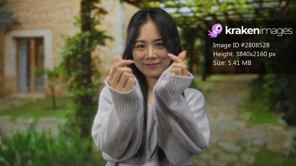 Woman smiling outdoors in serene garden setting with lush greenery and stone pathway, wearing cozy sweater and making heart gesture with hands, conveying warmth and happiness. - Kraken Images