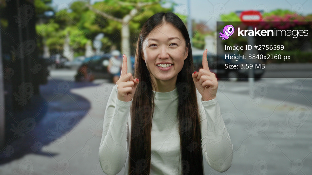 Woman smiling outdoors in urban city street setting with trees, wearing casual white attire and gesturing upwards joyfully during daytime.