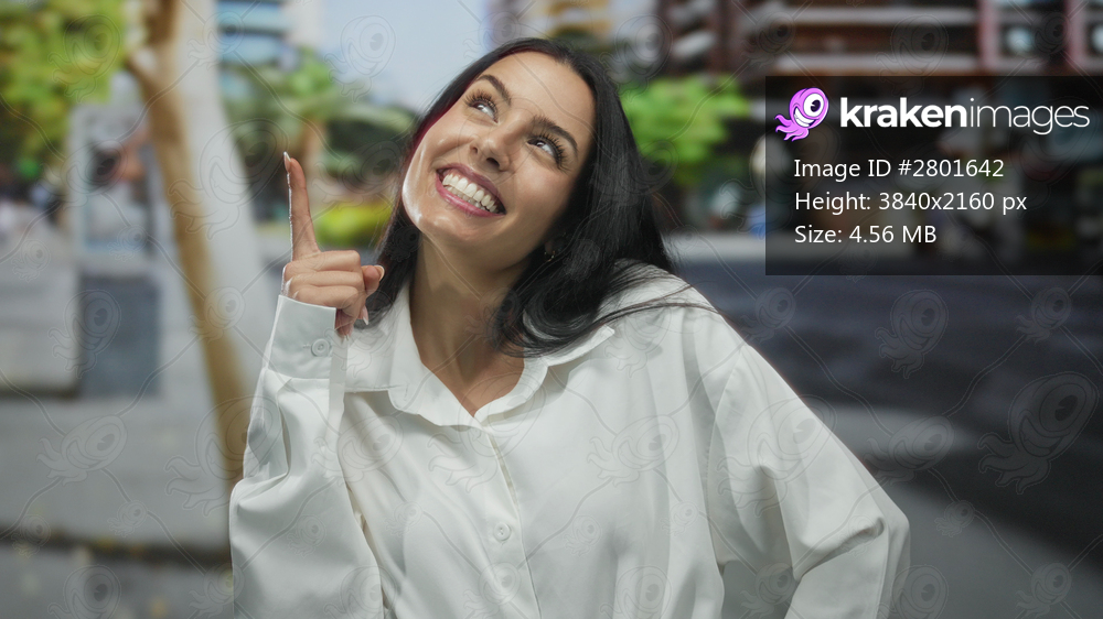 Woman smiling outdoors in urban street, wearing white shirt, pointing up with cheerful expression in city setting.