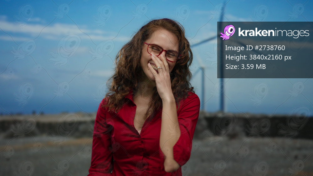 Woman smiling outdoors with long curly hair wearing red shirt and glasses in a field with windmill against blue sky