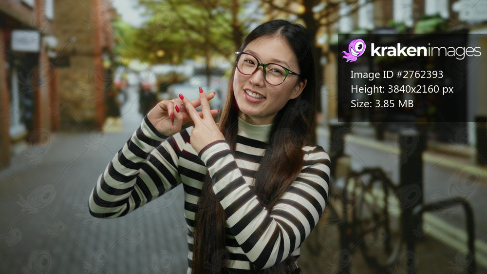 Woman smiling outdoors making a hashtag gesture on a vibrant urban street, embodying youthful energy and modern communication in an engaging city environment. - Kraken Images