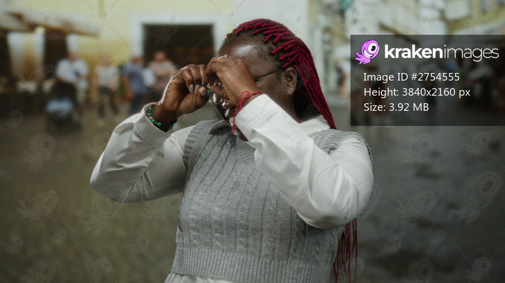 Woman smiling outdoors making binocular gesture with hands in city street wearing glasses and sweater with braids in casual urban setting.