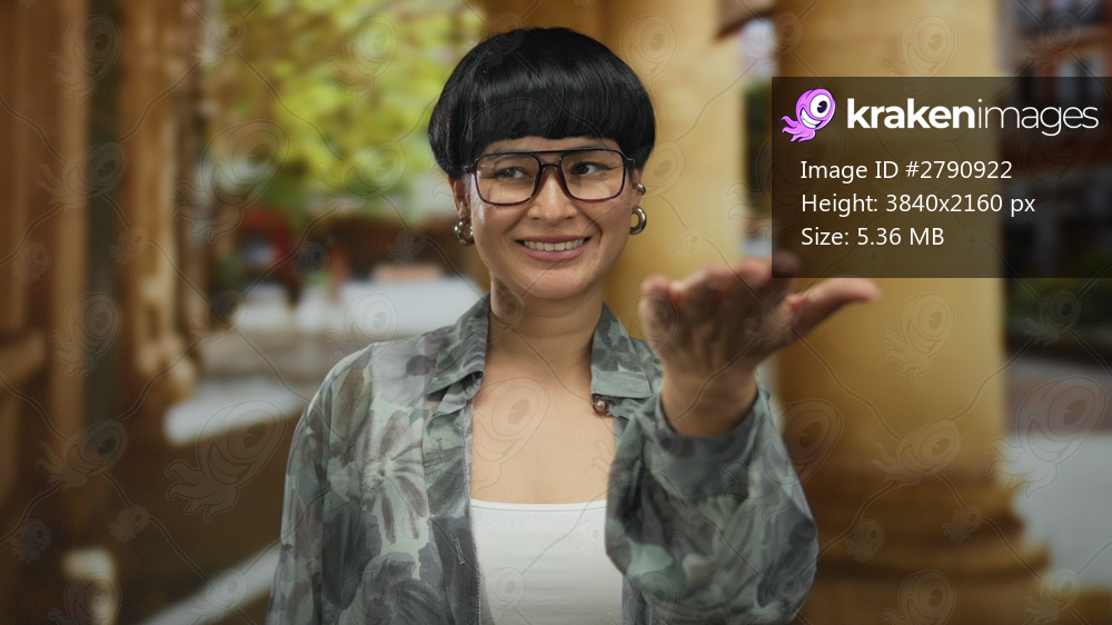 Woman smiling outdoors offering hand wearing glasses and blouse standing near columns in sunny urban setting emphasizing friendly trustworthy appearance.