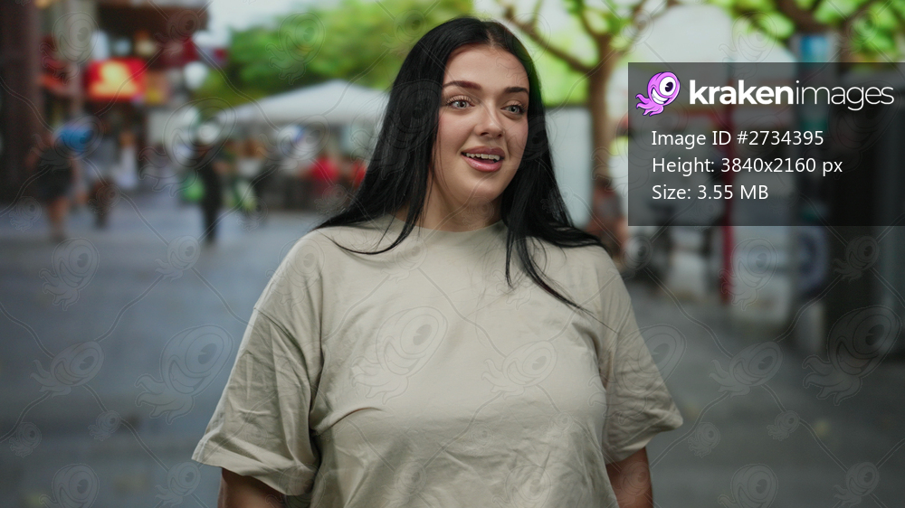 Woman smiling outdoors on a bustling city street with green trees in the background, embodying urban life and youthful energy in a casual beige outfit. - Kraken Images