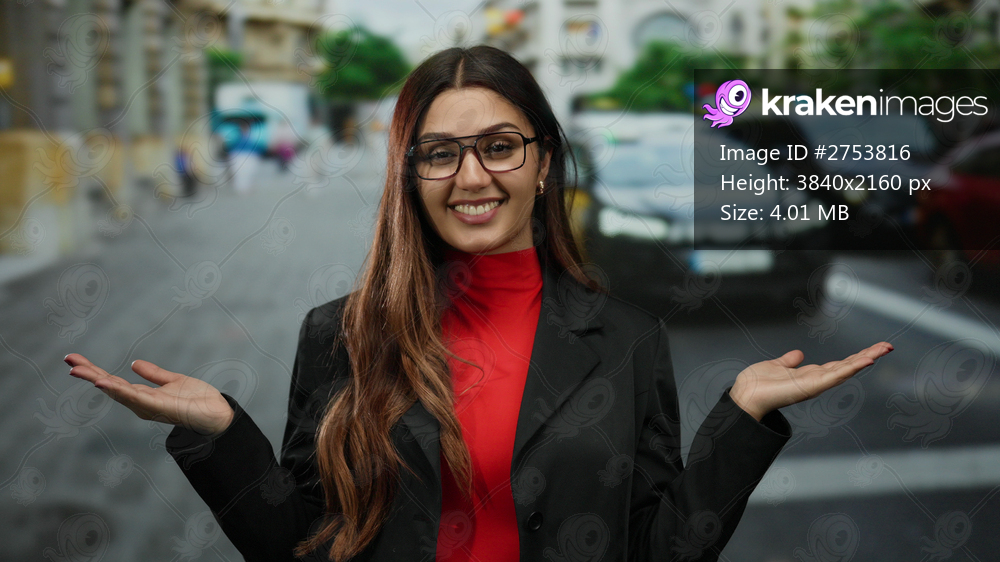 Woman smiling outdoors on a busy street with extended palms in a vibrant urban area on a sunny day, embodying a confident and positive attitude.