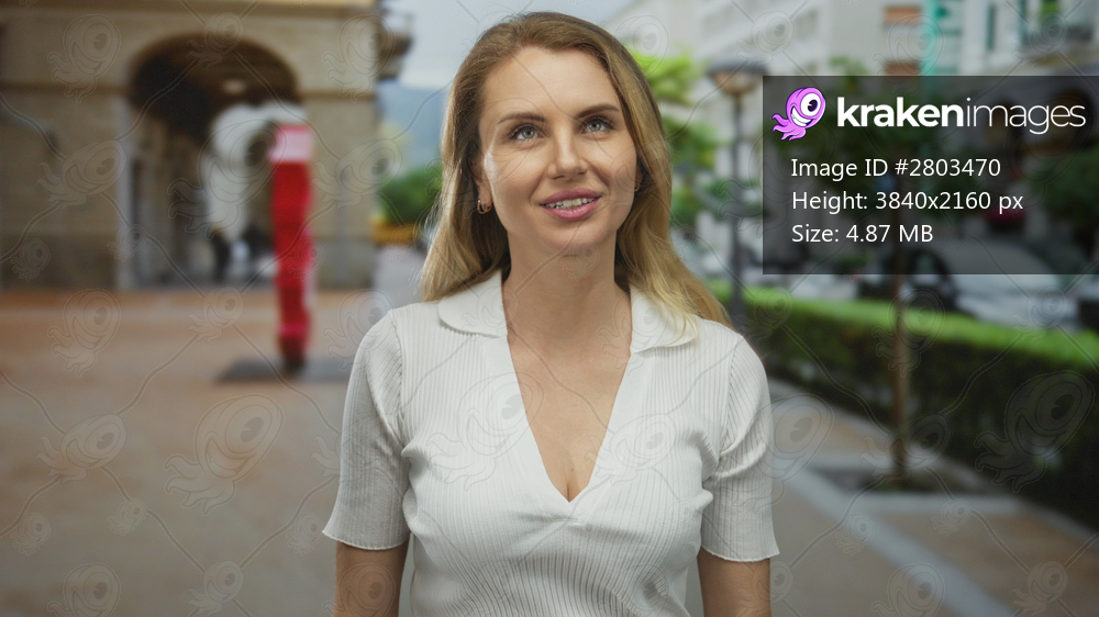 Woman smiling outdoors on a city street with a vibrant urban backdrop, embodying the energy of outdoor exploration and modern urban lifestyle in the city. - Kraken Images
