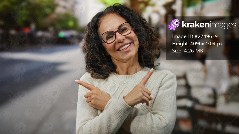 Woman smiling outdoors on a city street signals with hands in front of traffic during a sunny day wearing glasses and curly hair.