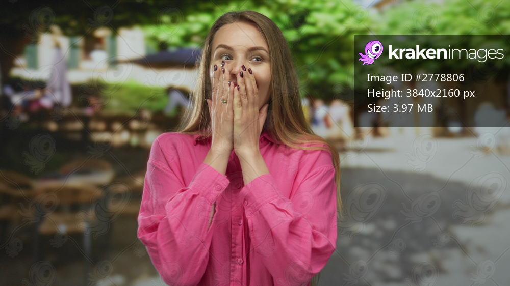 Woman smiling outdoors on a sunny city street with blurred buildings and trees, capturing urban joyful moment with a surprised, cheerful expression.