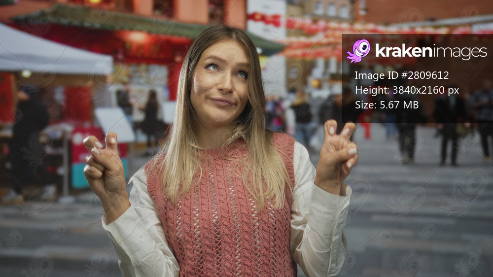 Woman smiling outdoors on busy city street gestures air quotes wearing casual outfit with vibrant urban backdrop enhancing lively atmosphere.