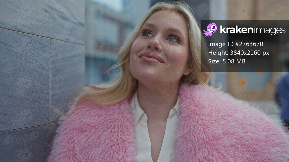 Woman smiling outdoors on city street in pink coat emphasizing fashion and joy with urban hustle in background.