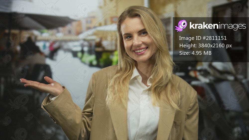 Woman smiling outdoors on city street with vibrant urban backdrop, extending hand to present something intriguing in a lively setting.