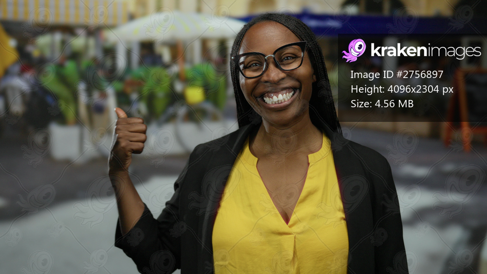 Woman smiling outdoors on city street with yellow shirt and glasses, showcasing positive vibes amidst urban backdrop.